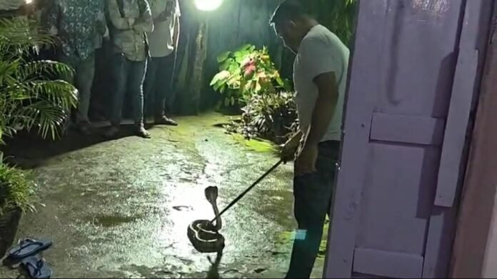 छत्तीसगढ़/कोरबा :- कोरबा जिले के सोनपुरी गांव में रहने वाली नागेश्वरी रजवाड़े उस समय सहम गई जब वो रात्रि के 8 बजे के आस पास घर पर पूजा कर रही थी और तभी एक विशाल काय कोबरा (नाग) कही से घर में घुस गया वो इतने बड़े सांप को देखते ही घर के दूसरे कमरे के अंदर भाग खड़ी हुई और आस पास के लोगों को फोन से सांप होने की जानकारी दी और मदद के लिए बुलाया फिर कुछ लोगों आए और उसको भगाने का प्रयास भी किया पर उसमें सफल नहीं हुए और वो एक किनारे गमले के पीछे जाकर बैठ गया फिर आस पास के लोगों ने इसकी जानकारी वाइल्डलाइफ रेस्क्यु टीम के प्रमुख जितेंद्र सारथी को दिया जिस पर सारथी थोड़ी देर में पहुंचने की बात कही गई फिर आखिरकार कुछ समय बाद सोनपुरी गांव पहुंच के 6 फीट के विशाल काय कोबरा ( नाग) को सुरक्षित तरीके से रेस्क्यु कर थैले में रखा गया तब जाकर सभी ने राहत भरी सांस लिया और जितेंद्र सारथी का धन्यवाद् ज्ञापित किया फिर उसे जंगल में छोड़ दिया गया।