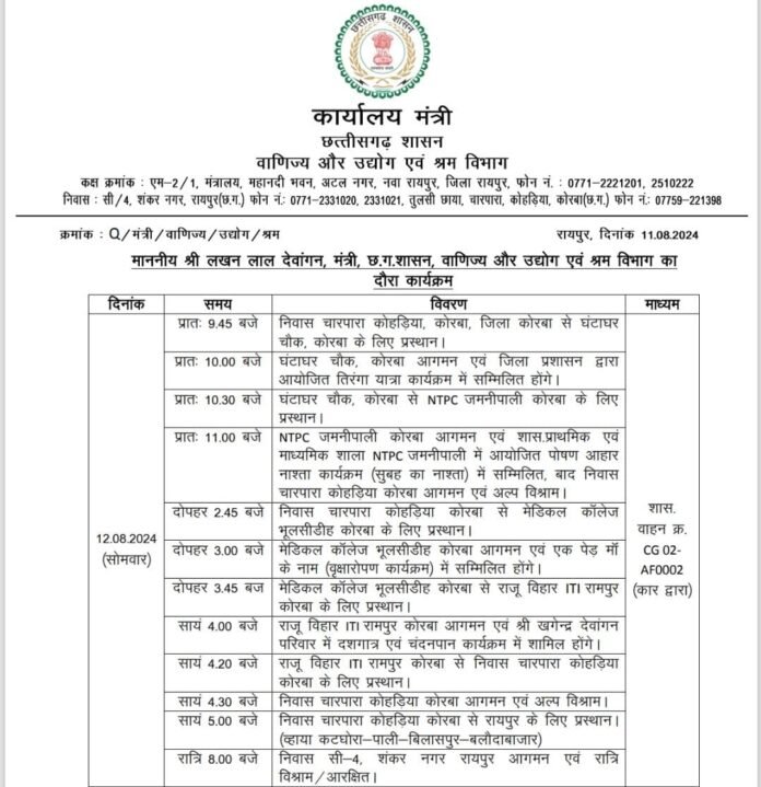 छत्तीसगढ़/कोरबा :-  हर घर तिरंगा अभियान के तहत जिले में 15 अगस्त तक विभिन्न गतिविधियां आयोजित किए जाएंगे। इसी कड़ी में 12 अगस्त को सुबह 9 बजे घंटाघर चौक में कार्यक्रम का आयोजन किया जाएगा। जिसमें मुख्य अतिथि श्री लखनलाल देवांगन,श्रम, वाणिज्य और उद्योग मंत्री, तिरंगा यात्रा को हरी झंडी दिखाएंगे। कलेक्टर श्री अजीत वसंत ने आमनागरिको से अपील की है कि वे तिरंगा यात्रा में शामिल होकर देश के वीर सपूतों, स्वतंत्रता सेनानियों को याद करते हुए इस महत्वपूर्ण क्षण में अपनी भागीदारी सुनिश्चित करें।