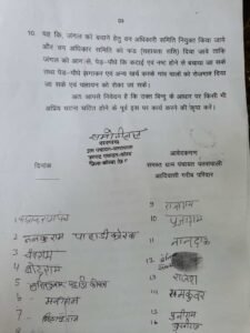 10. यह कि , जंगल को बचाने हेतु वन अधिकारी समिति नियुक्त किया जाये और वन अधिकार समिति को फंड ( सहायता राशि ) दिया जावे ताकि जंगल को आग से , पेड़ – पौधे कि कटाई एवं नष्ट होने से बचाया जा सके तथा पेड – पौधे लगाकर एवं अन्य खर्च करके गांव वालों को रोजगार दिया जा सके एवं पलायन को रोका जा सकें । अतः आपसे निवेदन है कि उक्त बिन्दु के आधार पर किसी भी अप्रिय घटना घटित होने के पूर्व इस पर कार्य करने की कृपा करें ।