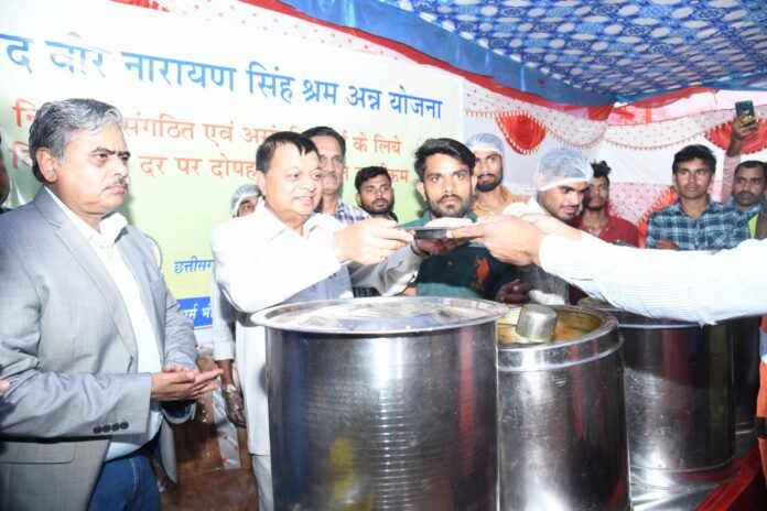 छत्तीसगढ़/कोरबा बालकोनगर :-  छ्त्तीसगढ़ शासन में उद्योग, वाणिज्य व श्रम मंत्री श्री लखनलाल देवांगन ने बालको संयंत्र के एलुमिना गेट के सामने कोरबा जिले के पहले अन्नपूर्णा दाल भात केन्द्र का शुभारंभ किया। छ्त्तीसगढ़ के शहीद वीर नारायण सिंह श्रम अन्न योजना के अंतर्गत निर्माण, संगठित एवं असंगठित वर्ग के श्रमिकों के लिए 5 रूपये राशि में भोजन की व्यवस्था की गई है। पंजीकृत हितग्राहियों को गरम व पौष्टिक भोजन प्रदान की जाएगी। कार्यक्रम के दौरान श्रम मंत्री श्री देवांगन और बालको के सीईओ राजेश कुमार ने श्रमिकों को भोजन परोसने के बाद उनके साथ बैठकर भोजन भी ग्रहण किया। कार्यक्रम में श्रम आयुक्त श्री राजेश आदिले, बालको के अधिकारी तथा श्रमिक संगठन के पदाधिकारी एवं बड़ी संख्या में श्रमिक उपस्थित थे।