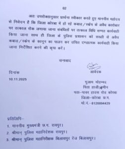 शिकायतकर्ता गुलाम मोहम्मद (निवासी—पावर हाउस रोड) ने पुलिस अधीक्षक को दी गई जानकारी में बताया है कि जिले में अवैध कबाड़ पर पूर्ण प्रतिबंध होते हुए भी चोरी का माल धड़ल्ले से खपाया जा रहा है। राताखार में अवैध यार्ड तक बना लिया गया है, वहीं फर्जी जीएसटी बिल और ई-वे बिल के सहारे कबाड़ बाहर भेजा जा रहा है, जिससे शासन को भारी राजस्व नुकसान हो रहा है। शिकायतकर्ता ने मांग की है कि इस पूरे नेटवर्क पर तत्काल कार्रवाई हो और पुलिस प्रशासन को सख्त निर्देश दिए जाएं ताकि कबाड़ माफियाओं पर रोक लग सके।