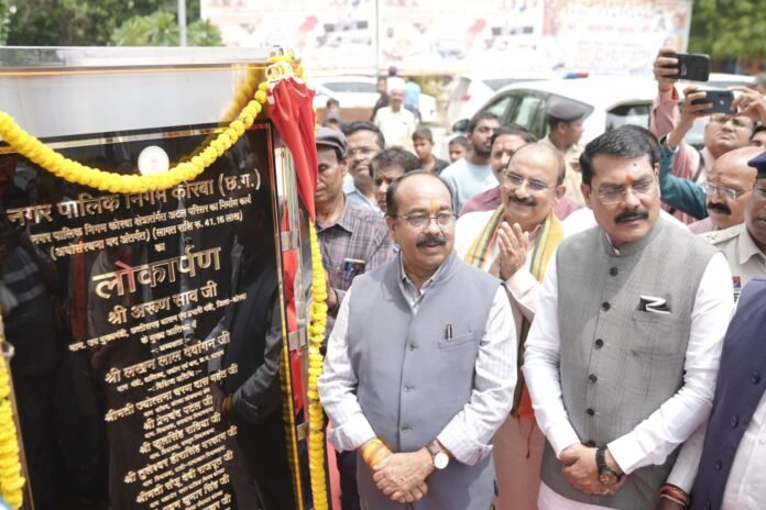 छत्तीसगढ़/कोरबा :- छत्तीसगढ़ शासन के उपमुख्यमंत्री, लोक निर्माण, लोक स्वास्थ्य यांत्रिकी, विधि व विधायी कार्य, तथा नगरीय प्रशासन मंत्री एवं जिले के प्रभारी मंत्री श्री अरुण साव और उद्योग मंत्री श्री लखनलाल देवांगन ने आज नगर पालिक निगम कोरबा अंतर्गत लगभग 30 करोड़ रुपए के विकास कार्यों का लोकार्पण और भूमिपूजन किया। जिसमें भूमिपूजन के 74 कार्य राशि 24 करोड़ 76 लाख और लोकार्पण के 19 कार्य राशि चार करोड़ 60 लाख रूपये शामिल है। उन्होंने विवेकानंद उद्यान के सामने अटल परिसर का लोकार्पण किया। उपमुख्यमंत्री श्री साव ने अटल परिसर में स्व श्री अटल बिहारी वाजपेयी जी के प्रतिमा का अनावरण किया। इस अवसर पर विधायक कटघोरा श्री प्रेमचंद पटेल, महापौर श्रीमती संजूदेवी राजपूत, सभापति श्री नूतन सिंह ठाकूर, कलेक्टर श्री अजीत वसंत, एसपी श्री सिद्दार्थ तिवारी सहित वार्ड पार्षद अन्य जनप्रतिनिधिगण, अधिकारी और आम नागरिक उपस्थित थे।