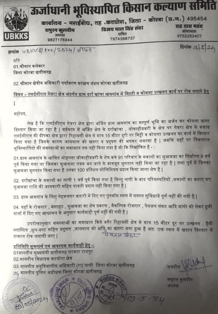 मुआवजा राशि की जानकारी सहित पावती प्रदान नहीं किया गया है ग्राम अमगांव के लिए नेहरूनगर बतारी में दिए गए पुनर्वास स्थल में समस्त सुविधायें पूर्ण नहीं की गयी है यहाँ के रोजगार, बसाहट, मुआवजा का शेष प्रकरण, वैकल्पिक रोजगार, पेयजल संकट आदि मांगो को लेकर हुयी वार्ता में दिए गए आश्वासन के अनुसार कार्यवाही पूर्ण नहीं की गयी है उन्होंने कहा हैं कि उपरोक्तानुसार समस्याओं का समाधान किये बगैर रिहायसी क्षेत्र से मात्र 15 मीटर दूर पर उत्खनन, हैवी ब्लास्टिंग, धुल-डस्ट सहित प्रदूषण, जानमाल को क्षति का खतरा बना हुआ है अतः उक्त स्थल में खदान विस्तार में तत्काल रोक लगायी जाए ।