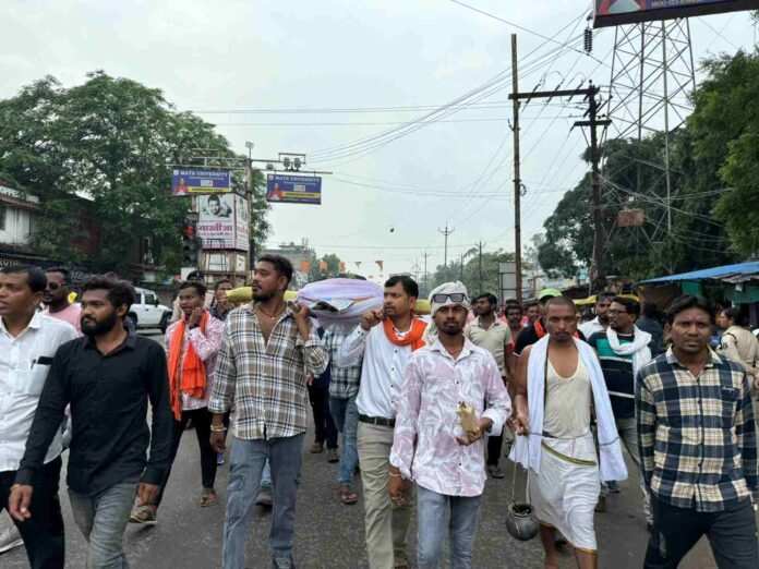 छत्तीसगढ़/कोरबा :- एसईसीएल कुसमुंडा परियोजना से प्रभावित भूविस्थापितों का आक्रोश बुधवार को फूट पड़ा। लंबे समय से रोजगार, पुनर्वास और मुआवजा जैसी मांगों की अनदेखी से नाराज ग्रामीणों ने एसईसीएल प्रबंधन की शवयात्रा निकालकर विरोध जताया और सुभाष चौक पर पुतला दहन किया। इसके बाद पदयात्रा कर बड़ी संख्या में ग्रामीणों ने कलेक्ट्रेट का घेराव कर सड़क पर बैठकर जोरदार नारेबाजी की।