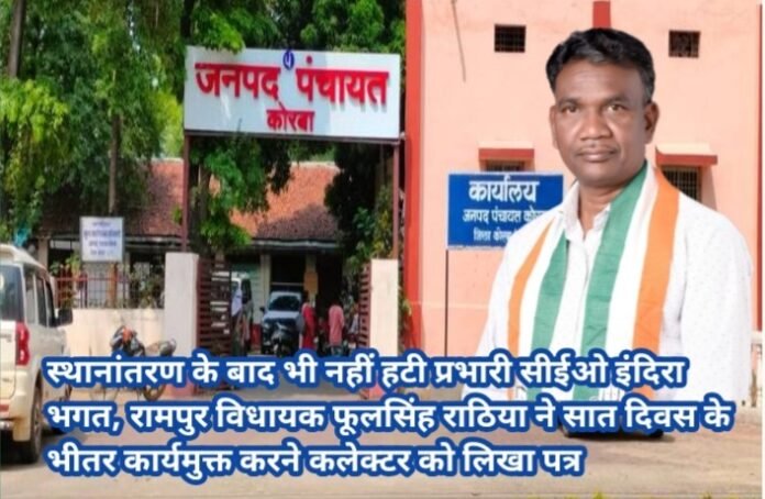 छत्तीसगढ़/कोरबा :- जनपद पंचायत कोरबा की प्रभारी सीईओ श्रीमती इंदिरा भगत पर खास मेहरबानी बनी हुई है। स्थानांतरण आदेश के बाद भी भारमुक्त नहीं किया गया है। जिसे लेकर रामपुर विधायक फूलसिंह राठिया ने कलेक्टर को पत्र लिखकर अधिकारी को 7 दिवस के भीतर नवीन पदस्थापना स्थल के लिए भारमुक्त करने की मांग की है ।