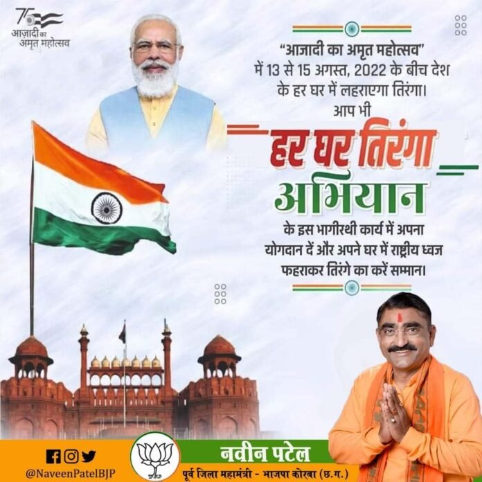छत्तीसगढ़/कोरबा :- आजादी के बाद देश में शायद यह पहला अभियान है जहां सभी देशवासी एकजुट होकर हर घर तिरंगा अभियान से जुड़ने जा रहे हैं प्रधानमंत्री नरेंद्र मोदी का अभियान हर घर तिरंगा की अपील के बाद देश में इस प्रकार का आजादी के बाद पहला अभियान है जहां 13 अगस्त से 15 अगस्त तक हर घर तिरंगा लहराएगा इस अभियान को अमृत महोत्सव के रूप में मनाया जाएगा इस अभियान को सफल बनाने देश के सभी देशवासियों में एकजुटता दिखाई दे रही है जहां हर घर तिरंगा अभियान को सफल बनाने देश के विभिन्न राज्यों की सरकारों ने भी इस अभियान को सफल बनाने में पार्टी वाद से हटकर देश प्रेम में रंगे नजर आ रहे हैं और इस अभियान को सफल बनाने हर संभव प्रयास कर रहे हैं हर घर तिरंगा अभियान को सफल बनाने प्रशासनिक अमला भी पूरी तरह मुस्तैद है ग्रामीण समूह की महिलाएं इस तिरंगा अभियान को सफल बनाने लगातार अपने समूह में तिरंगा बना रही है इससे उनकी आय में भी वृद्धि हो रही है और वह काफी खुश नजर आ रही हैं विभिन्न राजनीतिक पार्टियों के नेताओं में भी इस अभियान के प्रति देश प्रेम की भावना दिखाई दे रही है और वह अपने क्षेत्रों में इस अभियान को सफल बनाने में जुटे हुए हैं प्रधानमंत्री मोदी का सपना है कि इस अभियान के माध्यम से देश एक सूत्र में बंधे और एकजुटता का संदेश दे, यही कारण है कि आज देशवासी हर घर तिरंगा अभियान से जुड़कर एकजुटता और भाईचारे का संदेश अबकी बार इस स्वतंत्रता दिवस पर देने जा रहे हैं जहां हर घर में तिरंगा लहराएगा ।