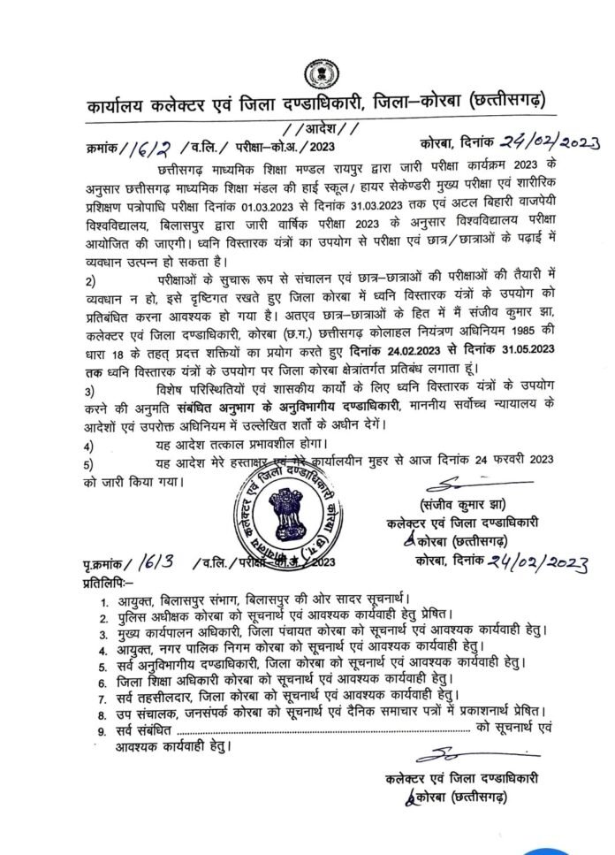 छत्तीसगढ़/कोरबा :- स्कूली बच्चों एवं महाविद्यालयीन विद्यार्थियों के आगामी परीक्षाओं को ध्यान में रखते हुए और जिले में ध्वनि विस्तारक यंत्रों के उपयोग पर प्रतिबंध लगा दिया गया है। परीक्षाओं के सुचारू संचालन एवं छात्र छात्राओं की परीक्षाओं की तैयारी में व्यवधान ना हो, इसके लिए जिले में आज से 31 मई 2023 तक ध्वनि विस्तारक यंत्रों के उपयोग पर प्रतिबंध लगाया गया है। कलेक्टर श्री संजीव झा ने इस संबंध में आदेश जारी कर दिए हैं। विशेष परिस्थितियों एवं शासकीय कार्यों के लिए ध्वनि विस्तारक यंत्रों के उपयोग करने की अनुमति संबंधित अनुभाग के अनुविभागीय दंडाधिकारी एवं माननीय सर्वोच्च न्यायालय के आदेशों एवं उपरोक्त अधिनियम में उल्लेखित शर्तों के अधीन होगी।