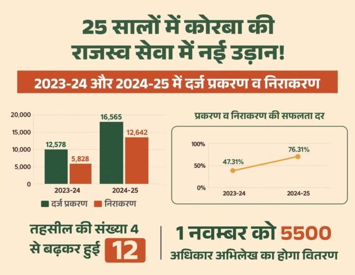यह 25 वर्षों की कहानी है बदलते कोरबा की, जहाँ शासन की पहुँच जनता तक, और जनता की आवाज शासन तक पहुँची है। राजस्व प्रशासन के इस सुदृढ़ीकरण ने कोरबा जिले को विकास और सुशासन की नई पहचान दी है। यह आमनागरिको के लिए बहुत सहूलियत साबित हो रही है।
