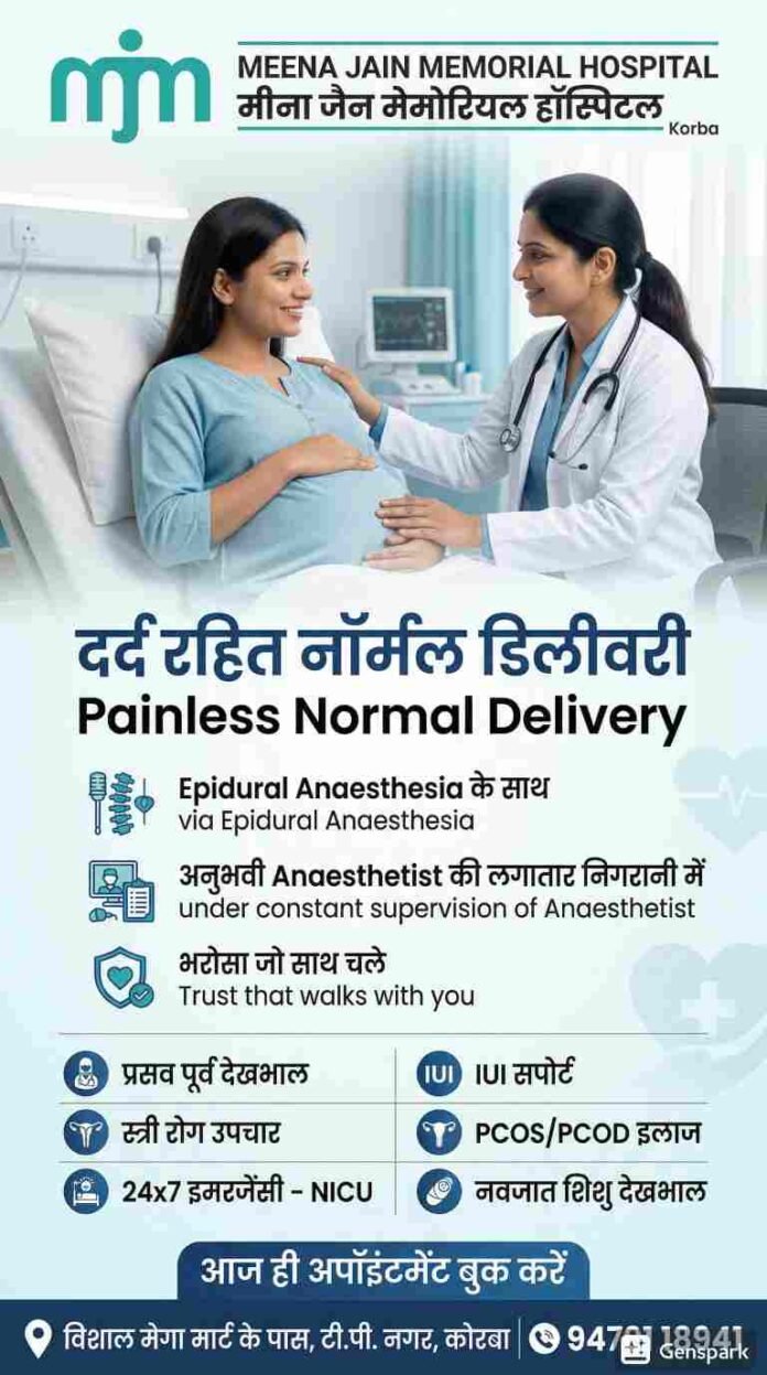 छत्तीसगढ़/कोरबा :-  शहर के स्वास्थ्य क्षेत्र में एक और महत्वपूर्ण कदम उठाते हुए मीना जैन मेमोरियल हॉस्पिटल ने गर्भवती महिलाओं के लिए दर्द रहित नॉर्मल डिलीवरी (Painless Normal Delivery) की आधुनिक सुविधा शुरू की है। इस सुविधा के माध्यम से अब प्रसव के दौरान महिलाओं को कम से कम दर्द का अनुभव होगा, जिससे उनका आत्मविश्वास और आराम दोनों बढ़ेंगे।