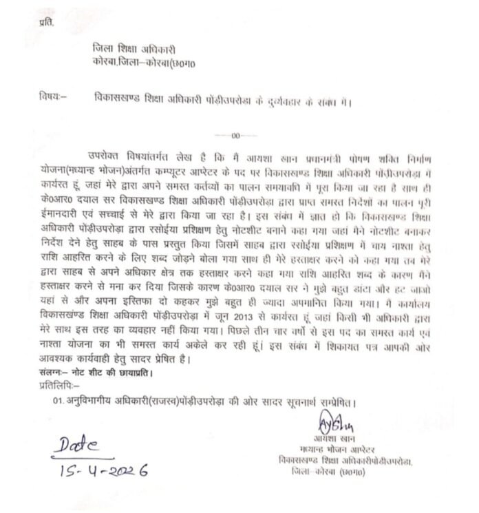 छत्तीसगढ़/कोरबा :- विकासखंड पोड़ी-उपरोड़ा में पदस्थ एक महिला कम्प्यूटर ऑपरेटर ने विकासखंड शिक्षा अधिकारी (BEO) पर गंभीर आरोप लगाते हुए जिला शिक्षा अधिकारी (DEO) को लिखित शिकायत सौंपकर कार्रवाई की मांग की है। मामले ने शिक्षा विभाग में हलचल मचा दी है।