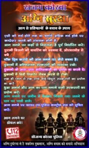 कोरबा पुलिस के द्वारा पैम्फ़लेट जारी कर दुकानदारों को अग्नि सुरक्षा के बारे में जागरूक किया जा रहा है आग लगने पर कहाँ से निकलना है पूर्व निर्धारित करे, पुरानी बिजली की कटी वायरिंग को बदलवा दें, दुकानों में अग्निशमन उपकरणों की व्यवस्था रखे, एक ही प्लग से एक साथ कई विद्युत उपकरणों का प्रयोग ना करें, ओरवरलोड से बचे।