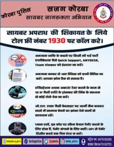 कोरबा पुलिस सभी से अपील करती है कि वे पुलिस के द्वारा चलाए जा रहे साइबर जन जागरूकता पखवाड़ा अभियान से जुड़ें और सजग कोरबा अभियान के व्हाट्सएप ग्रुप में जुड़े (जैसे फ्रेंड्स ग्रुप, कॉलोनी ग्रुप, सामाजिक ग्रुप ऑफिस ग्रुप और अन्य) के माध्यम से जागरूकता संदेशों को अधिक से अधिक शेयर करें, ताकि समाज के हर व्यक्ति तक साइबर सुरक्षा का संदेश पहुंच सके।