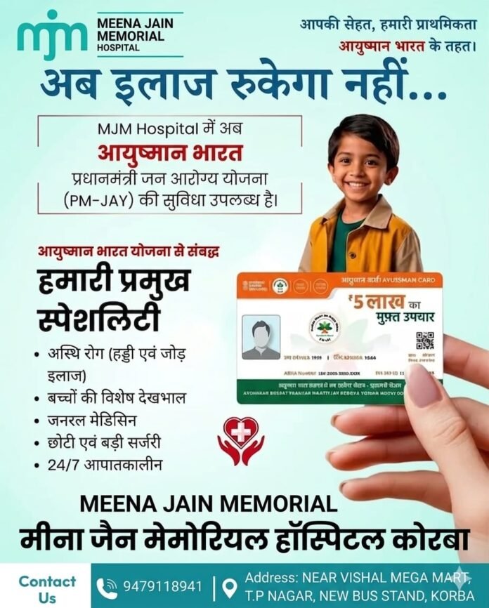 छत्तीसगढ़/कोरबा :-  शहर के स्वास्थ्य क्षेत्र में एक बड़ी राहत भरी खबर सामने आई है। Meena Jain Memorial Hospital (एमजेएम हॉस्पिटल) में अब आयुष्मान भारत प्रधानमंत्री जन आरोग्य योजना (PM-JAY) के तहत उपचार की सुविधा उपलब्ध करा दी गई है। इससे क्षेत्र के आर्थिक रूप से कमजोर वर्ग के मरीजों को बड़ी राहत मिलेगी।