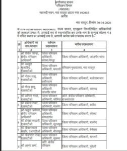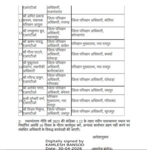 कुछ अधिकारियों को परिवहन मुख्यालय नवा रायपुर में पदस्थ किया गया है, जबकि कई को विभिन्न जिलों में जिला परिवहन अधिकारी के रूप में नई जिम्मेदारी सौंपी गई है।