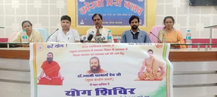 स्वामी परमार्थ देव जी के सान्निध्य में ऊर्जा नगरी कोरबा की पावन धरा पर 15 जनवरी को प्रातः 6:00 बजे से 7:30 बजे तक योग शिविर का आयोजन जैन मंदिर बुधवारी बाजार कोरबा में किया जाएगा. योग के माध्यम से लोगों को आरोग्य का प्रशिक्षण देकर स्वस्थ, समर्थ, स्वावलंबी भारत का निर्माण करने हेतु लोगों के भीतर जागरूकता का संचार करेंगे.