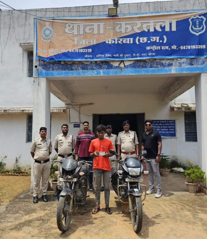 छत्तीसगढ़/कोरबा :- मामले का संक्षिप्त विवरण इस प्रकार है कि दिनांक 16.08.2024 को सकदूकला निवासी प्रार्थीया श्रीमती सुचित्रा चौहान, थाना उपस्थित आकर रिपोर्ट दर्ज करायी कि, दोहपर 03 बजे अपने गांव से पैदल नोनबिर्रा च्वाईस सेंटर के०वाई०सी० कराने जाते समय रास्ते में दो अज्ञात मोटर सायकल चालक प्रार्थीया के हाथ में रखे वीवो मोबाईल को लूटकर करतला तरफ भागने की रिपोर्ट पर थाना करतला में अपराध कमांक 76/2024 धारा 309 (4) बीएनएस एवं, कुदमुरा निवासी प्रार्थी मनमोहन राठिया की मोटर सायकल को दो अज्ञात व्यक्ति द्वारा चोरी कर ले जाने की रिपोर्ट पर कमांक 77/2024 धारा 303 (2) 3 (5) बीएनएस कायम कर वरिष्ठ अधिकारियों को अवगत कराकर पुलिस अधीक्षक सिद्धार्थ तिवारी (भा०पु०से०) से उचित दिशा निर्देश प्राप्त कर अति०पुलिस अधीक्षक यु०बी०एस० चौहान (रा०पु०से०) के मार्गदर्शन में नगर पुलिस अधीक्षक बेनेडिक्ट मिंज (रा०पु० से०) के नेतृत्व में कायमी पश्चात ग्राम कुदमुरा बेरियर पर नाकाबंदी दौरान दो मोटर सायकल चालक पुलिस को देखकर भागने लगे, पीछा कर आरोपी तिलकेजा निवासी शांतनू शर्मा पिता राकेश शर्मा उम्र 18 वर्ष को पकड़ा गया। जिनसे पूछताछ पर बताया कि दोनों घटना को अलग अलग समय पर अपने साथी दिनेश कंवर के साथ करना बताया। आरोपी दिनेश कंवर मोटर सायकल को छोडकर फरार हो गया। आरोपी के पास से घटना में प्रयुक्त मोटर सायकल सीजी 12 ए क्यू 6549 होण्डा साईन एवं प्रार्थीया से लूट की गई मोबाईल एवं चोरी की गई हीरो स्प्लेण्डर मोटर सायकल सीजी 12 ए एस 2036 को जप्त कर, आरोपी को विधिवत गिरफ्तार कर न्यायिक रिमाण्ड पर भेजा गया।