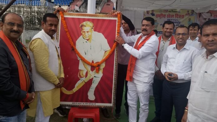 छत्तीसगढ़/कोरबा :- फिट इंडिया के तहत प्रधानमंत्री श्री नरेंद्र मोदी के आदेश अनुसार एवं मुख्यमंत्री श्री विष्णु साय के नेतृत्व में छत्तीसगढ़ प्रदेश भर में सांसद खेल महोत्सव का आयोजन किया जा रहा है जिसके तहत आज राज्यसभा सांसद श्री देवेंद्र प्रताप सिंह कोरबा प्रवास पर रहे कोरबा पहुंचने पर सीएसईबी गेस्ट हाउस में भारतीय जनता पार्टी जिला अध्यक्ष श्री भोपाल मोदी के नेतृत्व में भाजपा संगठन के समस्त कार्यकर्ताओं ने उनका जोरदार स्वागत किया स्वागत पश्चात राज्यसभा सांसद श्री देवेंद्र प्रताप सिंह भाजपा जिला अध्यक्ष गोपाल मोदी एवं भाजपा कार्यकर्ताओं के साथ ट्रांसपोर्ट नगर स्थित इंदिरा गांधी स्टेडियम मे नगर पालिका निगम एवं जिला प्रशासन कोरबा द्वारा मेजर ध्यानचंद की जयंती के अवसर पर आयोजित खेलकूद कार्यक्रम में शामिल हुए जहां उनके द्वारा मेजर ध्यानचंद की चलचित्र पर माल्यार्पण करते हुए सांसद खेल महोत्सव का शुभारंभ किया l और कार्यक्रम में उपस्थित खिलाड़ियों एवं भाजपा कार्यकर्ताओं को संबोधित करते हुए कहा कि मेजर ध्यानचंद हॉकी के जादूगर थे इसीलिए उनके जन्मदिवस को खेल दिवस के रूप में मनाया जाता है