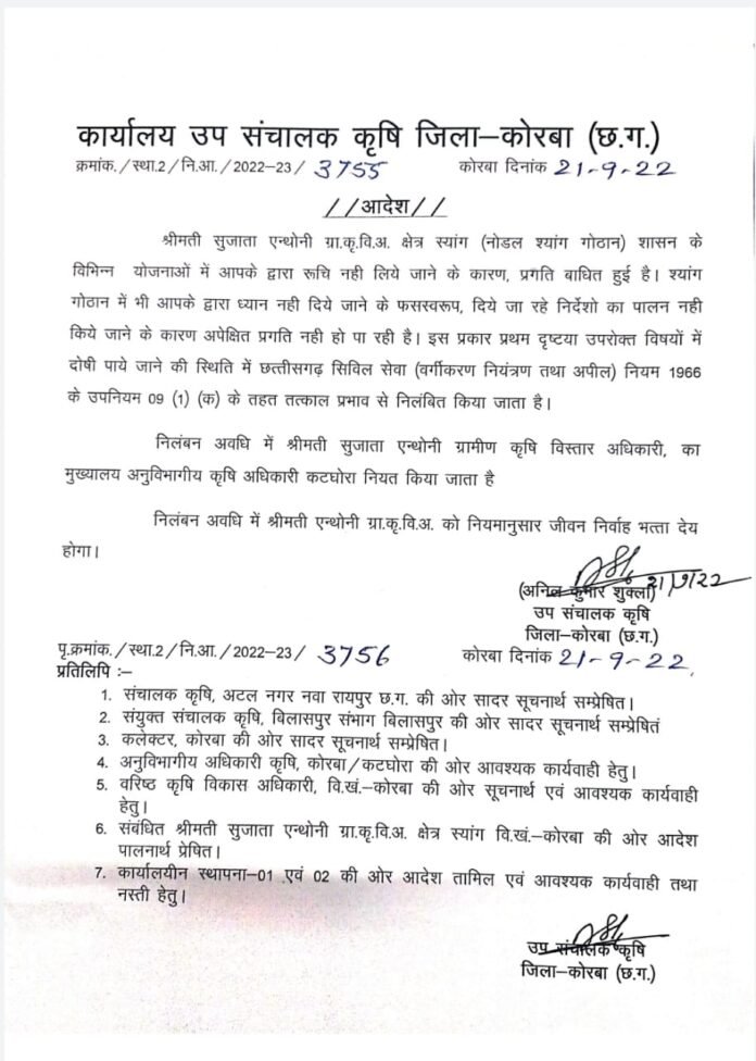 छत्तीसगढ़/कोरबा :- कलेक्टर श्री संजीव झा के निर्देश पर गौठान संचालन में लापरवाही बरतने और शासन के विकास मूलक कार्यो में रुचि नहीं लिए जाने पर ग्रामीण कृषि विस्तार अधिकारी को निलंबित कर दिया गया है। कलेक्टर श्री झा ने आज जिले के दूरस्थ वनांचल क्षेत्र श्यांग पहुंचकर गौठान का औचक निरीक्षण किया। गौठान निरीक्षण के दौरान उन्होंने गांव में विकसित किए गए गौठान में पहुंचकर गोबर खरीदी, वर्मी कंपोस्ट निर्माण, चारागाह क्षेत्र आदि का अवलोकन किया। गौठान में सही तरीके से वर्मी कंपोस्ट निर्माण नहीं होने पर कलेक्टर श्री झा ने श्यांग गौठान के नोडल अधिकारी एवं ग्रामीण कृषि विस्तार अधिकारी श्रीमती सुजाता एन्थोनी पर गहरी नाराजगी जताई। साथ ही चारागाह क्षेत्र में पर्याप्त मात्रा में चारा उत्पादन नही होने तथा बाड़ी विकास के कार्यो का भी संचालन ठीक ढंग से नही होने पर नाराजगी जताई। कलेक्टर ने ग्रामीणों को शासन के विभिन्न योजनाओं से लाभान्वित करने की महत्वपूर्ण योजनाओं के संचालन में लापरवाही बरतने और विकास कार्यों में रुचि नहीं लिए जाने पर नोडल अधिकारी श्रीमती सुजाता एंथोनी को तत्काल निलंबित करने के निर्देश मौके से ही उपसंचालक कृषि को दिए। कलेक्टर के निर्देश उपरांत उपसंचालक कृषि ने ग्रामीण कृषि विकास अधिकारी श्रीमती सुजाता एन्थोनी को तत्काल प्रभाव से निलंबित कर दिया है। निलंबन अवधि में श्रीमती सुजाता का मुख्यालय अनुविभागीय कृषि अधिकारी कार्यालय कटघोरा नियत किया गया है। निलंबन अवधि में उन्हें नियमानुसार जीवन निर्वाह भत्ता की पात्रता होगी।