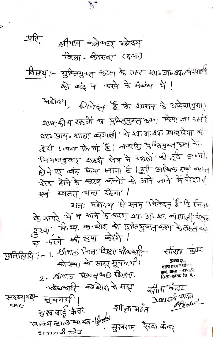 छत्तीसगढ़/कोरबा :- युक्ति युक्त कारण के तहत शासकीय प्राथमिक शाला बरपाली को शासकीय प्राथमिक शाला खमरिया में शिफ्ट किया जा रहा है जबकि दोनों विद्यालयों की दूरी लगभग डेढ़ किलोमीटर है जबकि युक्ति युक्त कारण के नियम के तहत शहरी क्षेत्र में 500 मीटर की दूरी में यदि दूसरा विद्यालय है तभी उसे समायोजन किया जा सकता है इस तरह छोटे-छोटे बच्चों को विद्यालय में पढ़ने के लिए डेढ़ किलोमीटर सफर करना पड़ेगा इस तरह का लिखित आदेश जिला शिक्षा अधिकारी के द्वारा जारी नहीं किया गया है लेकिन मौखिक आदेश पर खमरिया विद्यालय में शिफ्ट किया जा रहा है और शासकीय प्राथमिक शाला विद्यालय को बंद किया जा रहा है जिसमें शाला प्रबंधन समिति के अध्यक्ष सरिता कंवर ने कलेक्टर को पत्र लिखकर शासकीय प्राथमिक शाला बरपाली संकुल दुरपा विकासखंड कटघोरा को बंद नहीं करने के लिए निवेदन किया है।