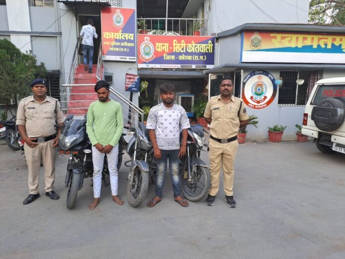 छत्तीसगढ़/कोरबा :- दिनांक 16.06.2023 को कोतवाली पुलिस को जरिये मुखबीर सूचना मिला कि दो युवक सीतामणी रेस्ट हाउस के पास चोरी की बाईक बिक्री हेतु ग्राहक की तलाश कर रहा है कि सूचना पर पुलिस अधीक्षक महोदय उदय किरण को अवगत कराकर आश्वयक दिशा निर्देश प्राप्त किया गया, अतिरिक्त पुलिस अधीक्षक महोदय अभिषेक वर्मा एवं नगर पुलिस अधीक्षक महोदय कोरबा विश्वदीपक त्रिपाठी के मार्गदर्शन पर नगर निरीक्षक रूपक शर्मा के नेतृत्व में कोतवाली पुलिस द्वारा मुखबीर के बताये स्थान सीतामणी रेस्ट हाउस के पास कोरबा पहुंचे जहां मुखबीर के बताये हुलियानुसार दो व्यक्ति मिले जो पुलिस को देखकर भागने का प्रयास किये जिसे कोतवाली पुलिस द्वारा घेरा बंदी कर पकड़े, जिसे नाम पता पूछने पर अपना-अपना इंद्रपाल साहू पिता जीवन लाल साहू, उम्र-19 वर्ष, सा. ग्राम कटोरी नगोई, चौकी – जटगा, थाना- कटघोरा, जिला – कोरबा (छ.ग.) व राहुल वैष्णव पिता निर्मल वैष्णव, उम्र 25 वर्ष, सा. अशोक नगर बिलासपुर, हा. मु. परसाभांठा बालको नगर कोरबा का रहने वाला बताये इंद्रपाल साहू के पास इन्द्रपाल के पास एक मोटर सायकल प्लेसर 220 सीसी काले रंग का जिसके नंबर प्लेट पर सीजी 14 एमके 9467 लिखा मिला तथा राहुल वैष्णव के पास एक नग मोटर सायकल अपाचे बिना नंबर ग्रे कलर का मिला जिनके संबंध में इन्द्रपाल साहू व राहुल वैष्णव को कागजात पेश करने पृथक-पृथक धारा 91 जा. फौ. का नोटिस दिया जो ने उक्त दोनों ने नोटिस में कोई कागजात नही होना लिखकर दिये तथा पुछताछ करने पर उक्त दोनों मो.सा. को जिला सूरजपुर से चोरी करना बताये तथा इन्द्रपाल साहू से पुछताछ पर एक और मोटर सायकल भी चोरी कर रेतघाट नदी किनारे चोरी कर छिपाना बताया। आरोपी इन्द्रपाल साहू के बताये स्थान रेतघाट नदी किनारे झाडी में इन्द्रपाल साहू के बताये अनुसार एक मोटर सायकल बजाज प्लसर एनएस 160सीसी काले रंग का जिसमें नंबर प्लेट नही लगा है को आरोपी इन्द्रपाल के कब्जे से बरामद कर जप्त किया गया। उक्त दोनों आरोपियों के द्वारा तीनों बाईक के संबंध में कोई वैध बिल / दस्तावेज पेश नहीं करने चोरी के माकूल संदेह पर आरोपी इंद्रपाल साहू व राहुल वैष्णव के विरूद्ध धारा – 41 ( 1 – 4 ) द.प्र.सं./ 379 भा. द. वि. के तहत इस्तगासा तैयार कर आरोपी को माननीय न्यायालय कोरबा में पेश किया जा रहा है। उपरोक्त कार्यवाही में नगर निरीक्षक रूपक शर्मा के नेतृत्व में प्र. आर. लक्ष्मीकांत खरसन, आरक्षक कवल चंद्रा, दिलेर सिंह मनहर, दिनेश श्याम, सुनील राजपूत, चंद्रकांत गुप्ता व दौलत कैवर्त की सक्रिय भूमिका रही ।