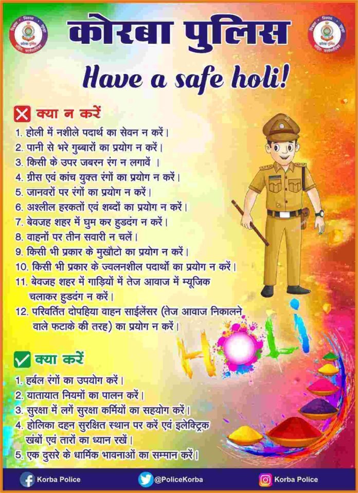 छत्तीसगढ़/कोरबा :- पुलिस अधीक्षक महोदय यू. उदय किरण (भा.पु.से.) के निर्देश पर कोरबा पुलिस के द्वारा नगर वासियों से अपील किया जाता है कि-