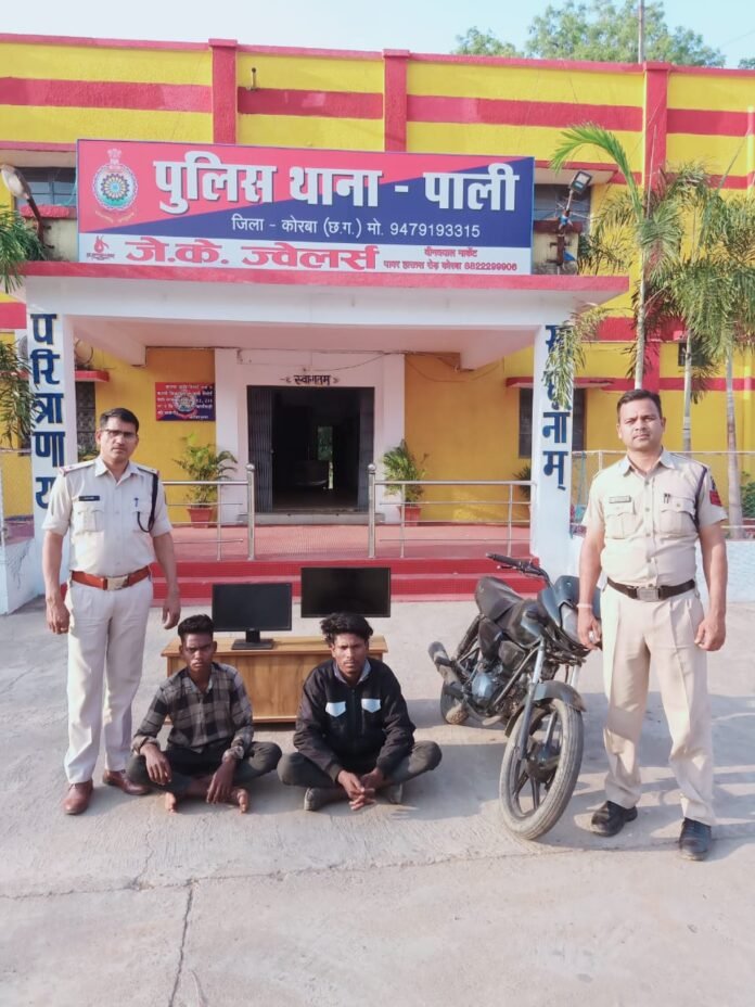 छत्तीसगढ़/कोरबा :- पुलिस अधीक्षक कोरबा सिद्धार्थ तिवारी द्वारा अवैध गतिविधियों में संलिप्त रहने वाले एवं विधि विरूद्ध कार्य करने वालों के विरूद्ध सख्त एवं प्रभावी कार्यवाही करने का निर्देष दिया गया जिस पर अतिरिक्त पुलिस अधीक्षक यू.बी.एस. चौहान एवं नेहा वर्मा के पर्यवेक्षण में अवैध गतिविधियों पर कार्यवाही किया जा रहा है। इसी कड़ी में दिनांक 25.02.2024 को प्रार्थी पंचराम पिता षिजलाल निवासी डिप्सीपारा नुनेरा थाना पाली जिला- कोरबा द्वारा थाना उपस्थित आकर लिखित षिकायत दिया गया शाम 06.30 बजे डूमरकछार बाजार गया था, अपने मोटरसायकल क्र. सीजी 12 एएल 6968 को बाजार के पास गोड़वाना कार्यालय के सामने खडा किया था जो बाजार करके वापस आने पर मोटरसायकल नहीं मिला, कोई अज्ञात चोर द्वारा चोरी कर ले गया था, कि रिपोर्ट पर पु.स.केन्द्र चैतमा थाना पाली में अज्ञात आरोपी के विरूद्ध अप.क्र. 93/2024 धारा 379 भादवि. पंजीबद्ध कर आरोपी की पतासाजी की जा रही थी कि मुखबीर सूचना मिली कि गोपालपुर चैतमा के पास एक बिना नम्बर एचएफ डिलक्स मोटरसायकल में विसाहू राम एवं प्रमोद गोड़ नाम का दो व्यक्ति आया है, सूचना पर घेराबंदी कर पूछताछ करने पर अपना नाम विसाहू राम चौहान पिता रामायण सिंह चौहान उम्र 23 वर्ष निवासी पोटापानी गडईहा पारा पुसके. चैतमा थाना पाली एवं दुसरा व्यक्ति ने अपना नाम प्रमोद गोड़ पिता गोविंद सिंह गोड़ उम्र 20 वर्ष निवासी ग्राम लाद चौकी कोरबी थाना पसान जिला-कोरबा होना बताया। दोनों आरोपी द्वारा दिनांक 17-18.12.2023 की दरम्यानी रात्रि को ग्राम कांजीपानी स्थित पंजाब एण्ड सिंध बैक का ताला तोड़कर एसीईआर कंपनी का मानिटर तथा दिनांक 25.02.2024 को डूमरकछार बाजार के पास से मोटरसायकल चोरी करना स्वीकार किया। आरोपी के कब्जे से चोरी किए गये एक नग एसीईआर कंपनी का मानिटर एवं मोटरसायकल को बरामद किया गया तथा आरोपी को विधिवत प्रकरण में गिरफ्तार कर न्यायिक रिमाण्ड पर भेजा गया है। पूर्व में ग्राम कांजीपानी स्थित पंजाब एण्ड सिंध बैंक में हुए चोरी की घटना के संबंध में प्रार्थी संतोष एक्का की रिपोर्ट पर दिनांक अप.क्र. 490/2023 धारा 457, 380 भादवि. कायम कर अज्ञात आरोपी की पतासाजी की जा रही थी जो आज दोनों अपराध में आरोपियों को गिरफ्तार करने में पुलिस को सफलता प्राप्त हुई है।