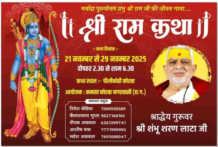 छत्तीसगढ़/कोरबा :- नगर में एक बार फिर आध्यात्मिक वातावरण गूंजने वाला है। 21 नवंबर से 29 नवंबर तक पीलीकोठी परिसर में श्रीराम कथा का भव्य आयोजन किया जा रहा है, जिसमें प्रतिदिन बड़ी संख्या में श्रद्धालुओं के पहुंचने की उम्मीद है। यह आयोजन पूरे कोरबा नगरवासियों की संयुक्त पहल पर निस्वार्थ भाव से किया जा रहा है।