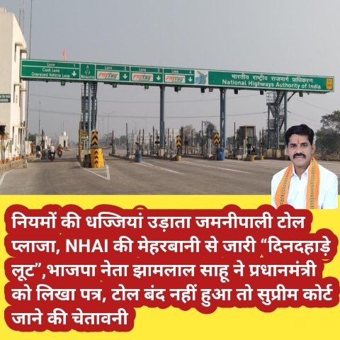 छत्तीसगढ़/कोरबा :- राष्ट्रीय राजमार्ग कोरबा–चांपा (NH-149B) पर स्थित जमनीपाली टोल प्लाजा एक बार फिर विवादों में घिर गया है। नियमों के खुले उल्लंघन और आम जनता से जबरन वसूली के गंभीर आरोप लगाते हुए भाजपा पिछड़ा वर्ग मोर्चा के प्रदेश कार्यसमिति सदस्य एवं पूर्व जनपद सदस्य झामलाल साहू ने प्रधानमंत्री को पत्र लिखकर टोल प्लाजा को तत्काल बंद करने की मांग की है।