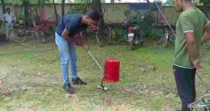 छत्तीसगढ/कोरबा :- कोरबा जिला के करतला तहसील स्थित तुमान गांव के हाई सेकेंडरी स्कूल में उस समय अफरा तफरी का माहौल बन गया। जब स्कूल प्रांगण में जहरीले कोबरा सांप को देखा गया। स्कूल प्रांगण में जहरीले सांप को देख बच्चों के बीच दर का माहौल बन गया था। तब ही स्कूल के स्टाफ विकास कुमार सोनी जी ने साहस दिखाते हुए एक बाल्टी से सांप को ढक दिया और देरी ना करते हुए इस घटना की जानकारी आर.सी.आर.एस संस्था के अध्यक्ष अविनाश यादव को दी।