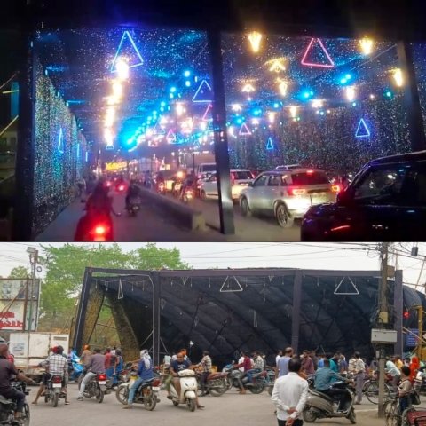 छत्तीसगढ़/कोरबा :- 9 अप्रैल को हिंदू नव वर्ष के शुभारंभ की तैयारी कोरबा में जोर शोर से की जा रही है। इस अवसर पर नगर में भव्य शोभायात्रा निकाली जायेगी जिसके लिए पूरा शहर दुल्हन की तरह सजाया जा रहा हैं। विद्युत बल्बों की रँगीनिया देखते ही बनती हैं। इस साज-सज्जा को वक्त बे वक्त बदलते मौसम का ग्रहण इस साल भी लग गया जिसने पावर हाउस रोड में नहर पुल पर लगाये गए पण्डाल को धराशाई कर दिया। पंडाल गिरने से एक बड़ी घटना घट सकती थी लेकिन गनीमत रही की कुछ नहीं हुआ, वही शहर के अंदर सड़क के किनारे लगे पेड़ों में लगी लाइटों से भी खतरा बना हुआ है, पेड़ पौधों में अचानक करंट फैलने से अनहोनी की आशंका बनी हुई है ।