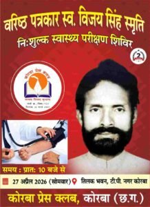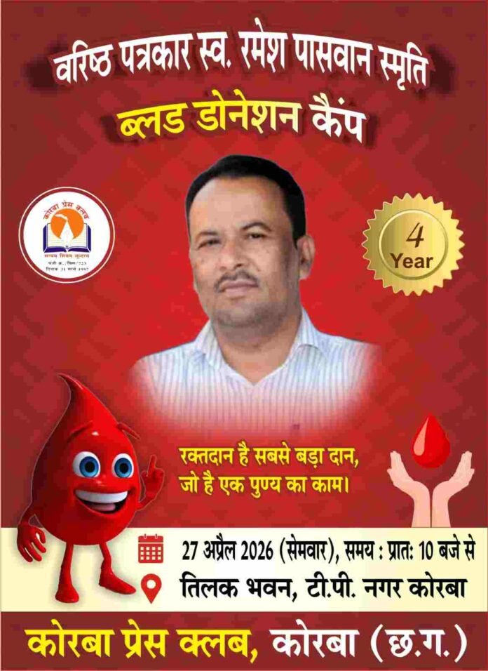 छत्तीसगढ़/कोरबा :- जिले के वरिष्ठ पत्रकार स्व. रमेश पासवान एवं स्व. विजय सिंह की स्मृति में कोरबा प्रेस क्लब द्वारा एक सराहनीय सामाजिक पहल की जा रही है। उनके प्रति श्रद्धांजलि अर्पित करते हुए 27 अप्रैल 2026 (सोमवार) को स्वैच्छिक रक्तदान एवं नि:शुल्क स्वास्थ्य परीक्षण शिविर का आयोजन किया जाएगा। यह शिविर टी.पी. नगर स्थित तिलक भवन (कोरबा प्रेस क्लब) में सुबह 10:00 बजे से दोपहर 2:00 बजे तक आयोजित होगा। आयोजन की तैयारियां पूर्ण कर ली गई हैं और इसे सफल बनाने के लिए स्व. बिसाहू दास महंत स्मृति चिकित्सा महाविद्यालय के अस्पताल अधीक्षक द्वारा विशेषज्ञ चिकित्सकों की ड्यूटी लगाई गई है।